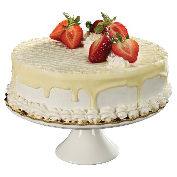 <p>Classic white cake layers made from scratch and filled with strawberry mousse. Iced in homemade buttercream and decorated with swirls of whipped cream icing and fresh strawberries.</p>