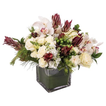 <p>Designed in a clear cube vase with Green Aspidistra Leaves, Garden Roses, Spray Roses, Burgandy Hypericum, Pine Sprays, White &amp; Burgandy Cymbidium Orchids, and White Roses.</p>